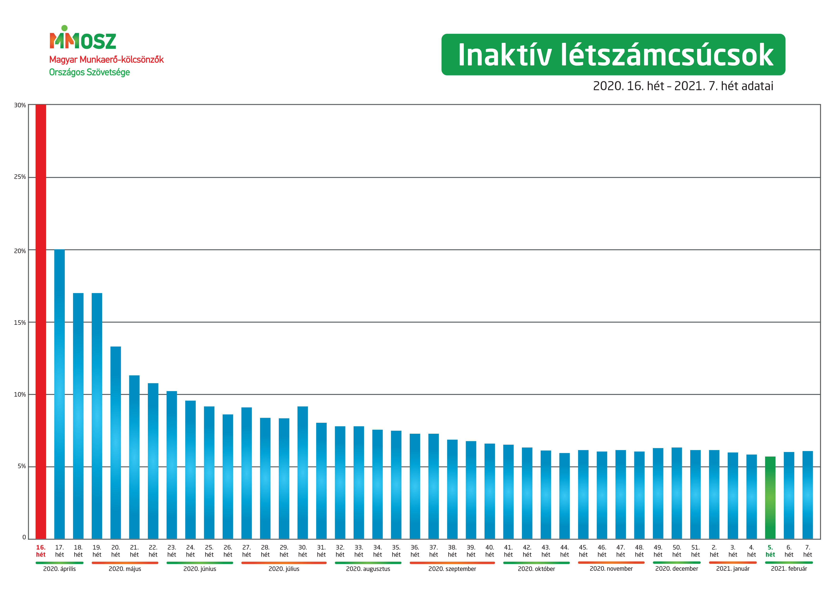 A COVID-19 kitörésekor történt átszervezések eredményeként hirtelen több mint háromszorosára emelkedett az inaktív státuszban lévő* kölcsönzöttek aránya, de már április végére beállt a válság előtti ebben az időszakban megszokott tíz százalék alatti szintre, idén februárra pedig ennek is felére süllyedt. A konkrét megbetegedések aránya két százalék alatt maradt – derül ki a szektor kétharmadát lefedő Magyar Munkaerő-kölcsönzők Országos Szövetsége (MMOSZ) közléséből.