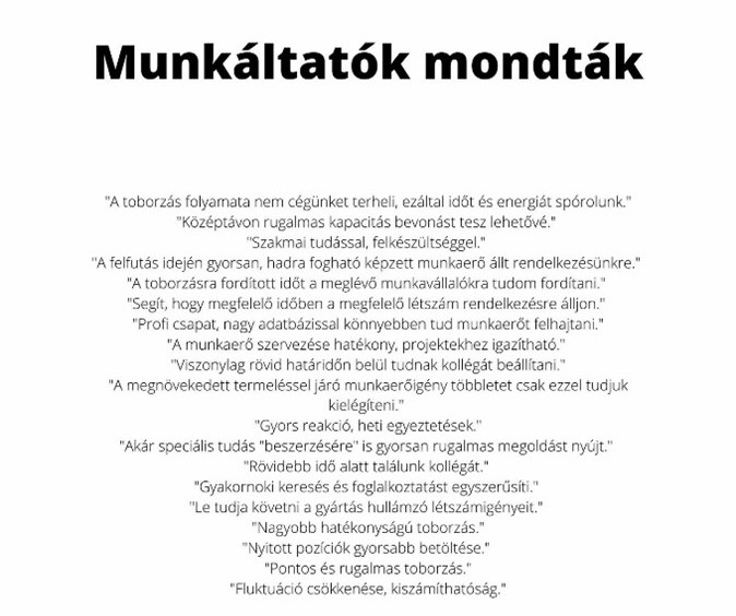 A munkaerőpiac hullámzásainak kiküszöbölői a munkaerő-kölcsönzők. Eredményes toborzással, megfelelő rugalmasságot és költséghatékony működést biztosítanak. Több évtizedes szakértelmük jelentős segítséget jelent a munkáltatók mindennapi életében – derül ki szektor kétharmadát lefedő Magyar Munkaerő-kölcsönzők Országos Szövetsége tagszervezeteinek és érdekképviseleti munkájukat támogató több piacvezető cég körében végzett legfrissebb közös kutatásból.